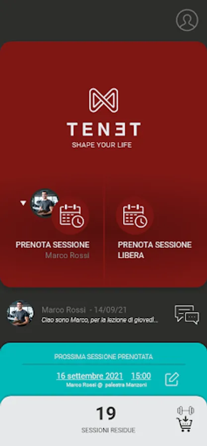 The app in question has the purpose of allowing customers who want to train in the Tenet gym to be able to book one or more available lessons. The customer can choose the gym where to train and can choose the coach. Before proceeding with the booking of the lesson, the customer must have purchased a package of lessons, if this has not happened the system directs the customer to purchase a package of their choice. The client can communicate with the coaches and with the management via messages. In the application there is a section for trainers where they can set the availability calendar and a section for the administration that can check the lessons they have taken.