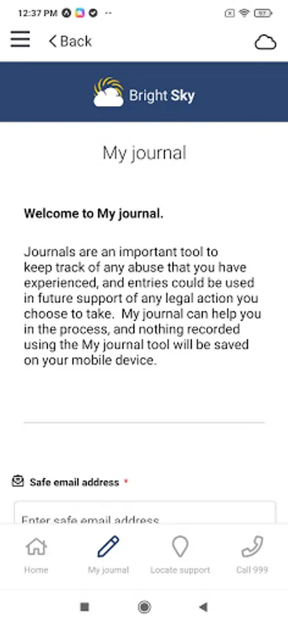 A secure My Journal tool, where incidents of abuse can be logged in text, audio, video or photo form, without any of the content being saved on the device itself.