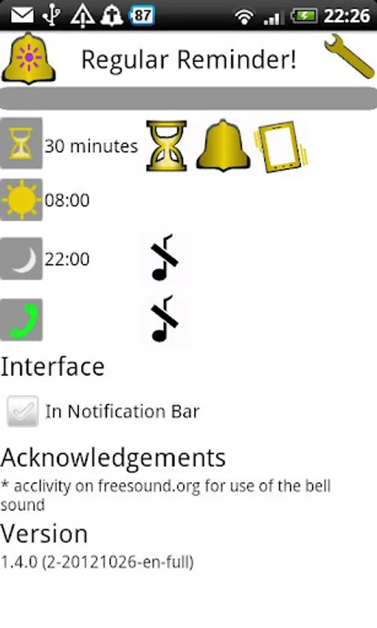 * Configuration screen available via the widget, by running app or tapping notification bar (if set to be there!).