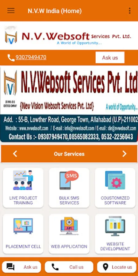 N.V. Websoft Services Pvt. Ltd. is an ISO 9001:2015 certified web designing and software development company in Allahabad(Prayagraj) U.P. India, Since 2012, we are serving many popular institutions and businessmen and in the city. Our passion and dedication in software development field is the key factor of our success. Quality has the prime importance in our service. We excel in a wide range of services like website designing, website development, customize development, Bulk SMS, domain registration, windows hosting, linux hosting.