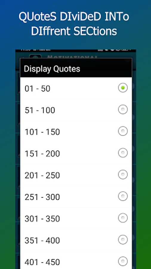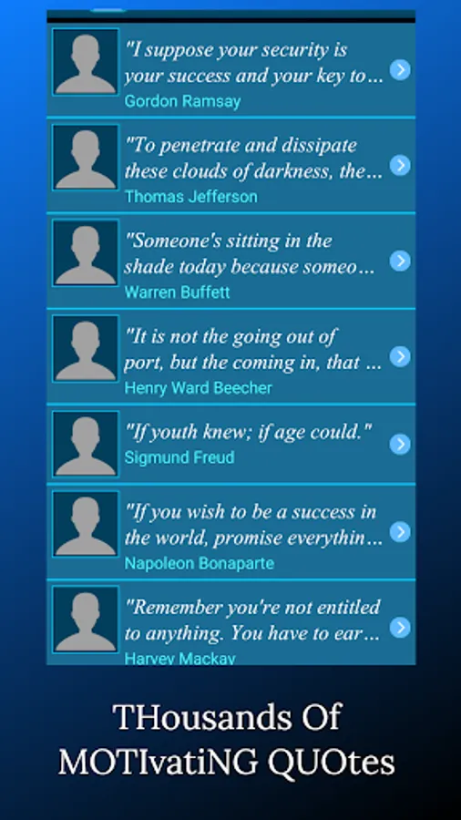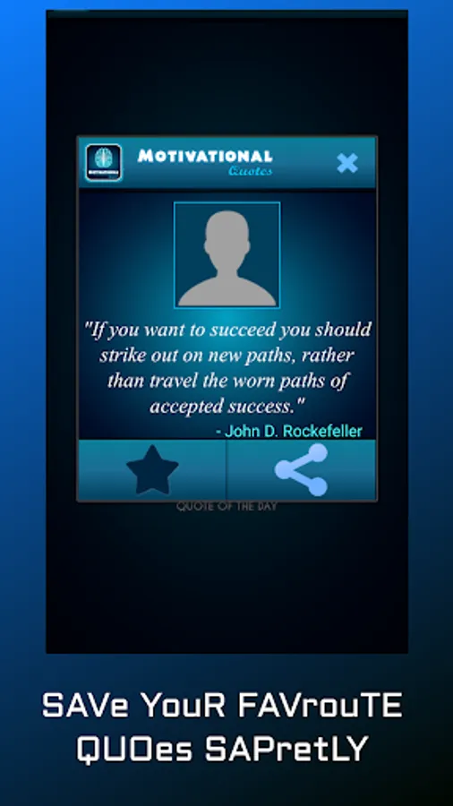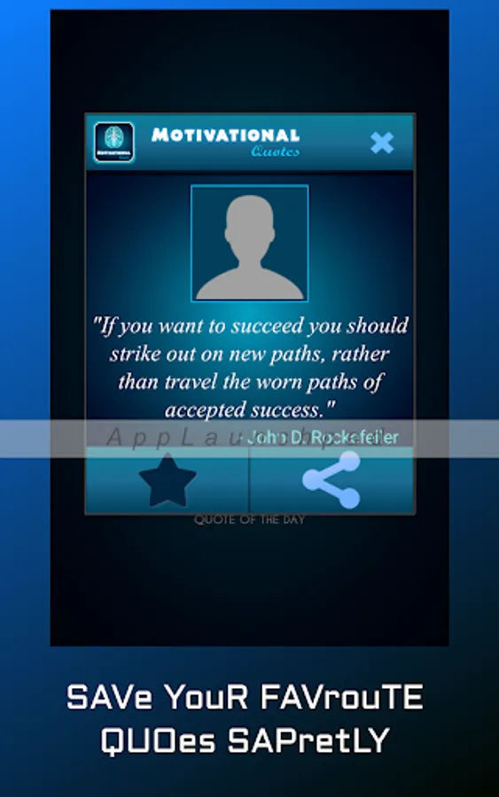 MotivationalQuotes is an android application motivating you to hard work and to be enthusiastic to achieve your goals and make your dreams come true.It has 1000 motivational quotes for more than 200 authors. You are free to browse all of them directly by authors or you can receive a quote of the day every day at the time you specify . Also you can share any quote by different ways (sending to your friend by whats app,email and SMS). Keep your enthusiasm up.