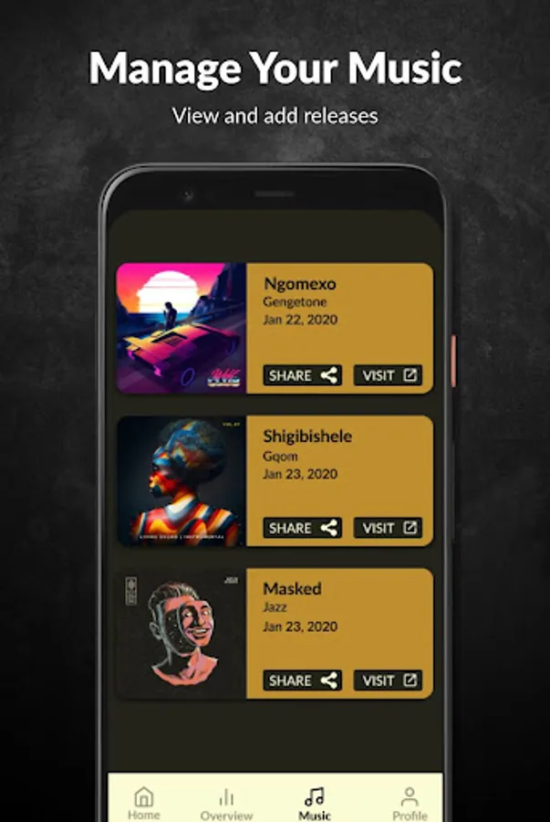 Set up the artist page, upload your music - and you’re good to manage your music on the go - Newwell will deliver your audio/s and metadata to online streaming stores.