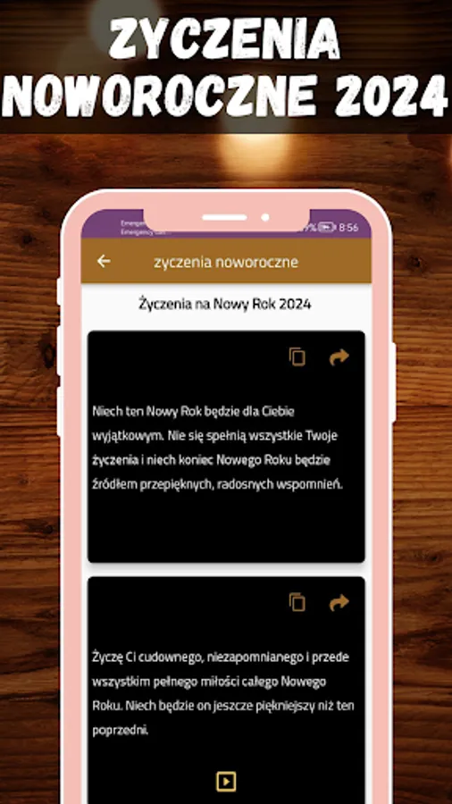 Wishes for the new year 2024 is another category that is available in our application. The New Year is the time when most people make wishes to each other, set goals and plans for the next year and organize various events and meetings. There you will find many wonderful wishes that will be the perfect way to convey your best wishes during the holidays. Our wishes will surely warm the heart of every person you give them to, and make them feel especially cared for and appreciated at this special time. Do not wait and browse our wishes for the new year 2024 today to create unforgettable moments with your loved ones.