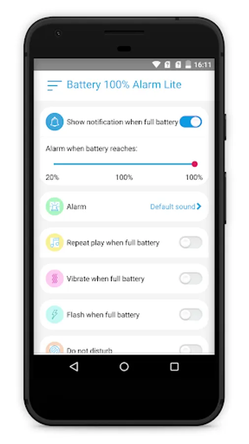 There is no need to turn on battery alarm. The Battery 100% Alarm Lite app is based on automation so it will do everything automatically and give battery alarm.