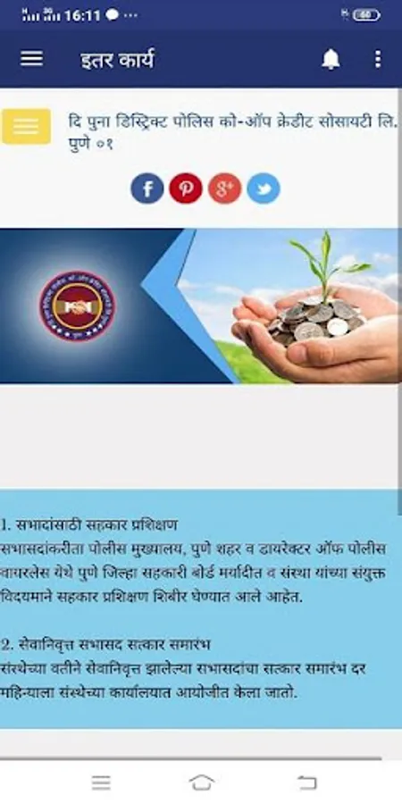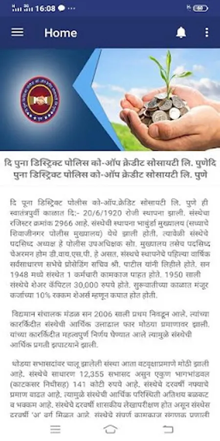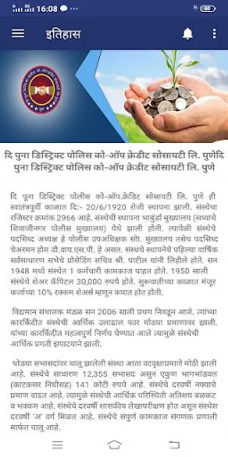 The Poona District Police Co-op. Credit Society Ltd. Pune was established on 20/6/1920 in the pre-independence period. The organization's register number is 2966. The organization was established at the headquarters of Bhabunda (now Shivajinagar Police Headquarters). Deputy Commissioner of Police at the time, the designated president of the organization. Headquarters as well as the designated Chairman Home DYSP It used to be. Shri. Proceeding Secretary of the first Annual General Meeting of the institute. Written by Patil. In the year 1948, there was 1 employee in the organization. In 1950, the share capital of the organization was Rs 30,000. Initially, 10% of the loan amount was deducted as shares.