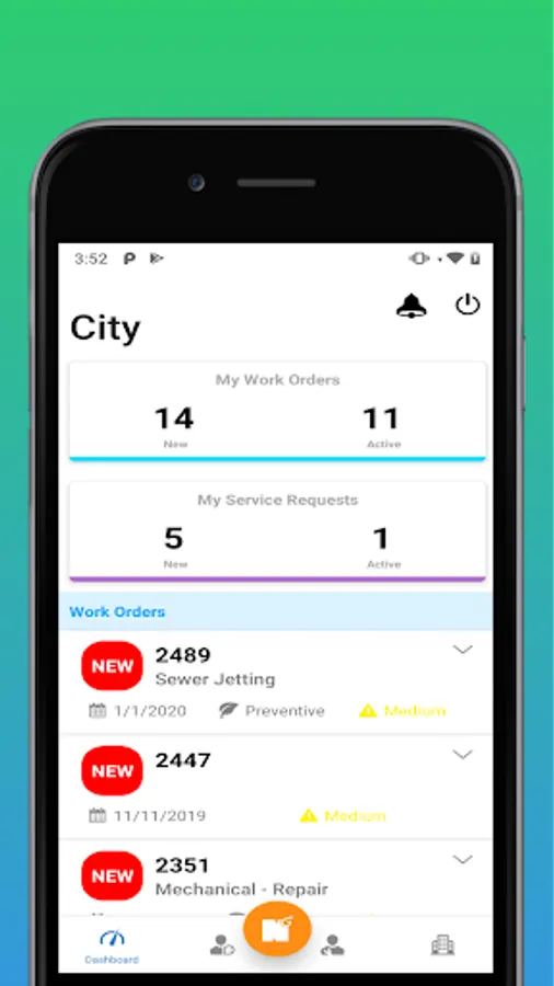 - DASHBOARD: Users can quickly view their top three work orders and service requests from the home screen with the ability to quickly view additional details on the go or get directions directly to the work site.