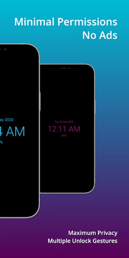 Contains NO ADS at all and minimum permissions. Not even internet is requested. Designed with absolute user privacy and optimal battery usage in mind.