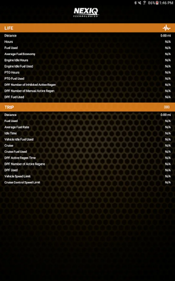 • Life / Trip – Displays trip-specific information related to fuel usage, miles, maximum speed, cruise control speed, hours of operation, etc.