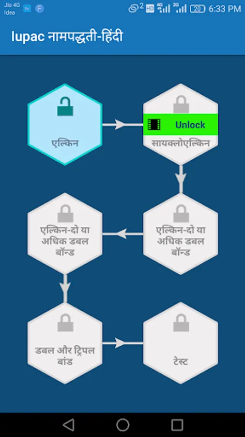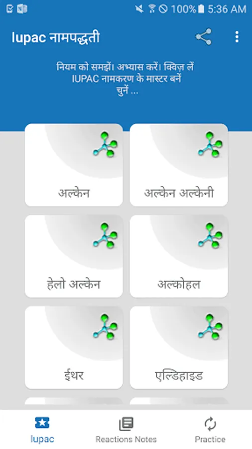 IUPAC नामकरण की कला में महारत हासिल करने के लिए, बार-बार और नियमित अभ्यास की आवश्यकता होती है, यह ऐप सावधानीपूर्वक डिज़ाइन किए गए पाठ्यक्रम द्वारा छात्रों की मदद करने की कोशिश करता है।