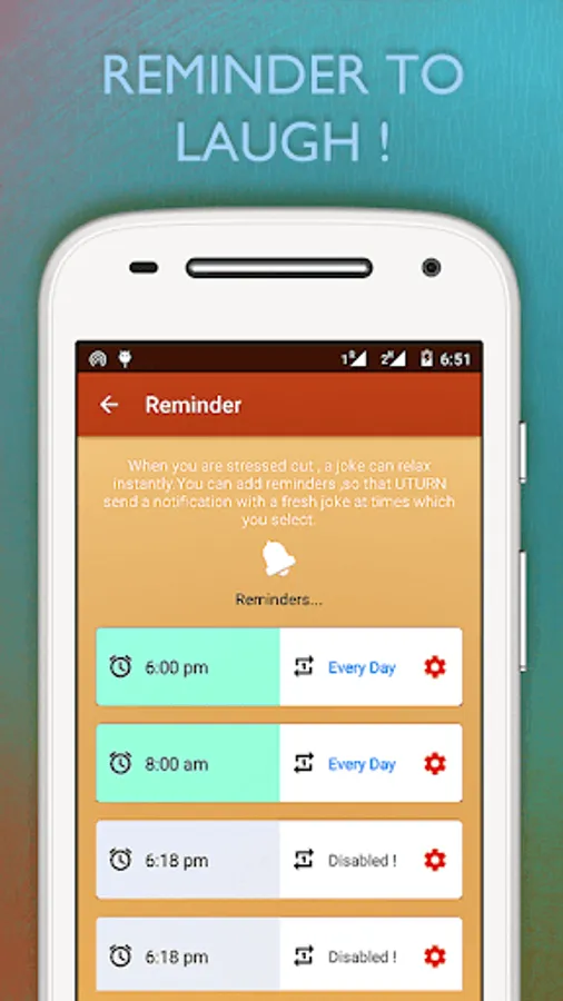 You can set Reminders so that Uturn reminds you to laugh at regular intervals .This helps to keep stress levels low.