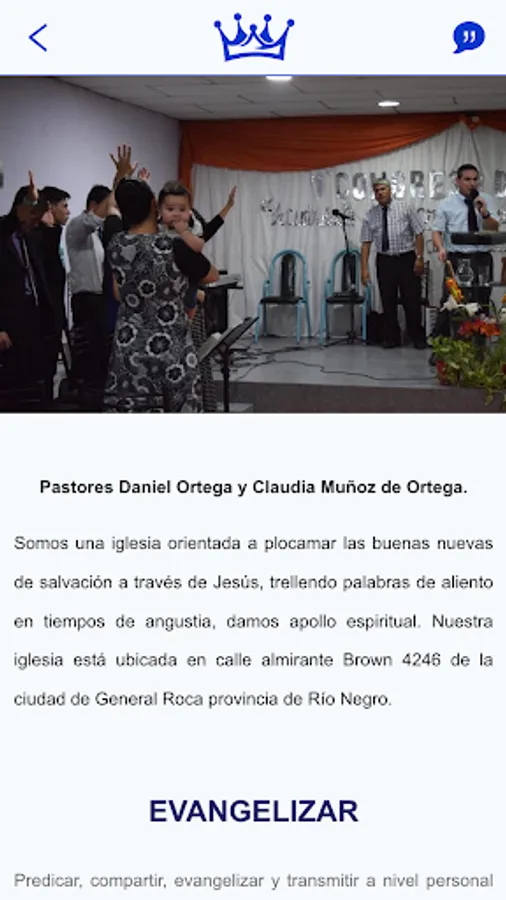 We are a church oriented to proclaim the good news of salvation through Jesus, having words of encouragement in times of distress, we give spiritual support. Our church is located at Calle Almirante Brown 4246 in the city of General Roca, province of Río Negro.