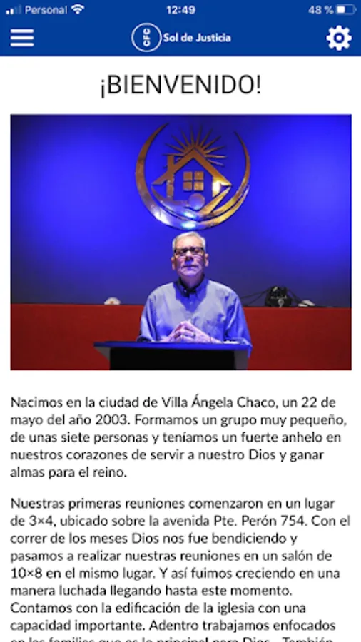 Our first meetings began in a 3 × 4 place, located on Pte. Perón 754 avenue. As the months passed, God blessed us and we began to hold our meetings in a 10 × 8 room in the same place. And so we were growing in a struggling way until now. We have the building of the church with an important capacity. Inside, we work focused on families, which is the main thing for God. - We also carry out solidarity assistance, taking clothes, shoes and picnic areas for children through our Foundation through the different deprived neighborhoods of our city. "SOL y DAR y DAD" .-