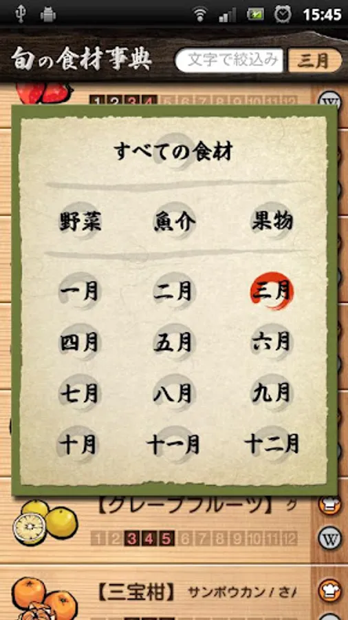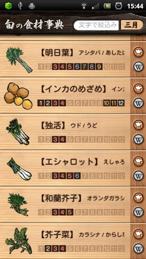 As the name implies, "Dictionary of seasonal food" is an application which allows you to view a list of seasonal ingredients.