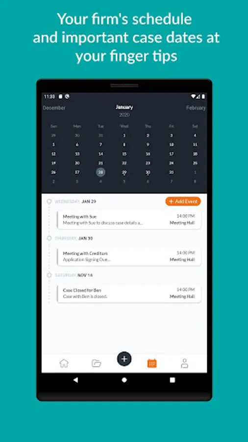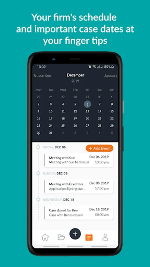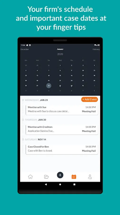 - Your firm's schedule is always in your pocket in an upcoming events list and calendar view so you never miss a deadline, meeting, or court date.