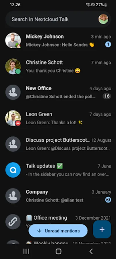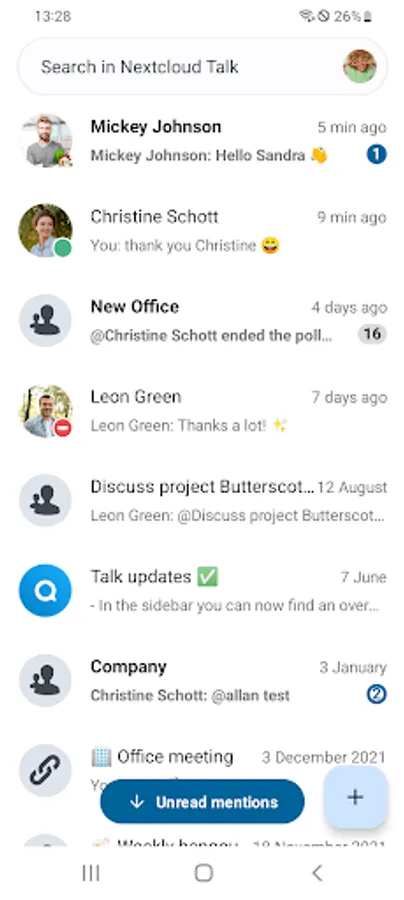 Use Nextcloud Talk to have one-on-one or group audio or video calls, create or join web conferences and send chat messages. All communication is fully encrypted and mediated by your own server, providing the highest degree of privacy possible.