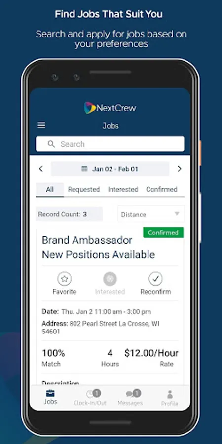 Best matching job are automatically available to you based on your location, schedule, skills and other preferences. You can review job details and apply with a click or even save them as your favorites. Once a job is confirmed will notify you with all the required details. We will even send you a reminder before the job starts. You can also get direction to your work location or download to your calendar.