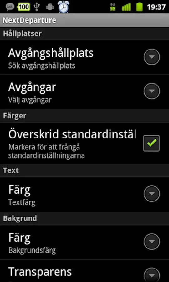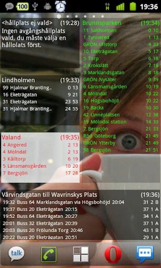 Displays real time departure times if they exists or scheduled times for a specific stop. It's possible to display only those departures that traffic a certain stop by choosing a via stop. The widget layout are the following: line number, destination, next departure time, next next departure time. If Västtrafik has no contact with the vehicle the scheduled departure time is displayed instead which is indicated with parentheses.