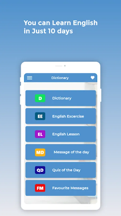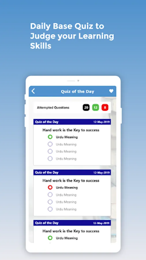 - Test – app has a unique feature of MCQ (Multiple Choice Question) test to learn more words