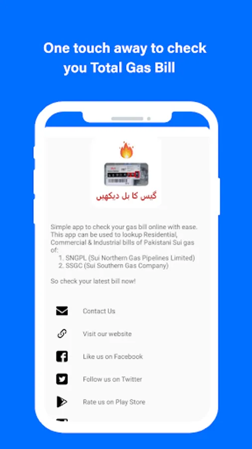 It is clarified that we do not represent the government entity. Our app only serves the purpose of online SNGPL, SSGPL or SSGS bill amount. Our app only serves the purpose of showing SNGPL, SSGPL or SSGS to the users for their convenience. The Data showed in the app is available online for the general public.