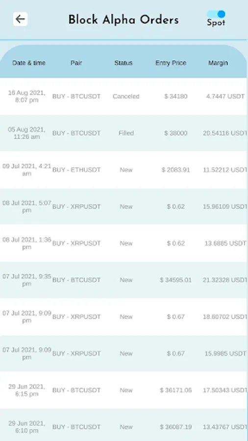 A tabulated history of all trades is easily referenced allowing yoy to view futures and spot trades placed using Block Alpha