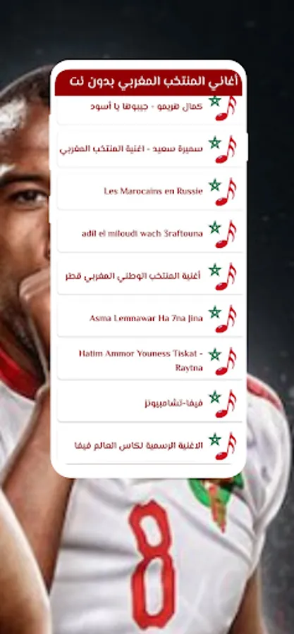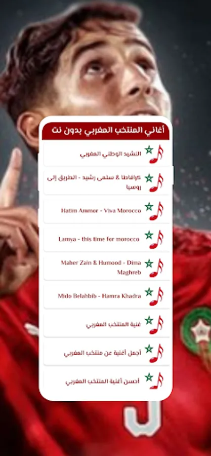 The "Moroccan National Team Songs Without Net" application is the perfect application for all Moroccan football fans and the Moroccan national team. It's the all-in-one app that gives you quick and easy access to a variety of songs and chants that represent the spirit and enthusiasm of the Moroccan national team, without the need for an internet connection.