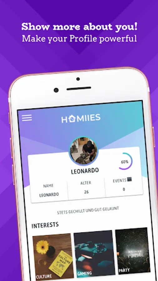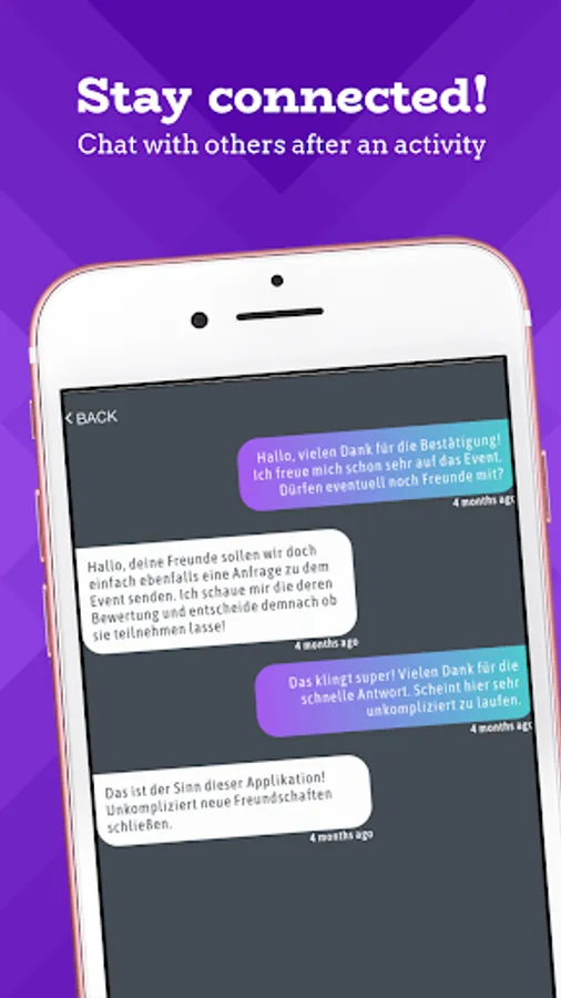 For example, you can create an event about sports, bar-hopping, pre-drinks or anything else. Other users have the opportunity to send you a request for your event. YOU decide who you want to participate. After you have confirmed a user, it is possible to chat with each other and to exchange.