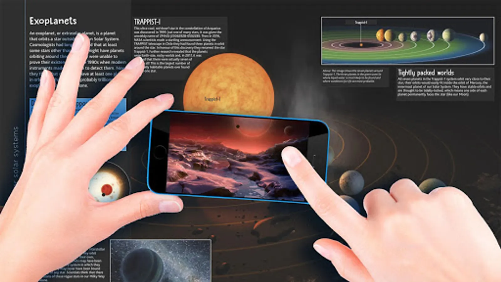 TapADot-Universe contains 67 fantastic videos of planets, stars, galaxies and more. Your smartphone or tablet will allow you to play the videos by making eye contact with the illustrations. Just click on the red dots and enjoy the show.