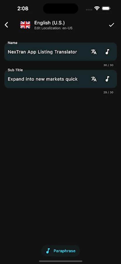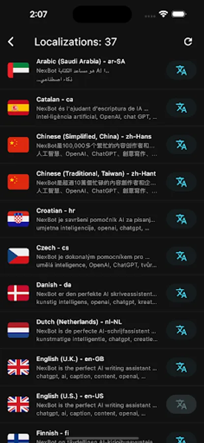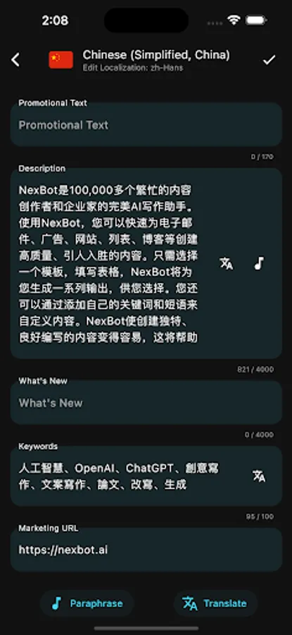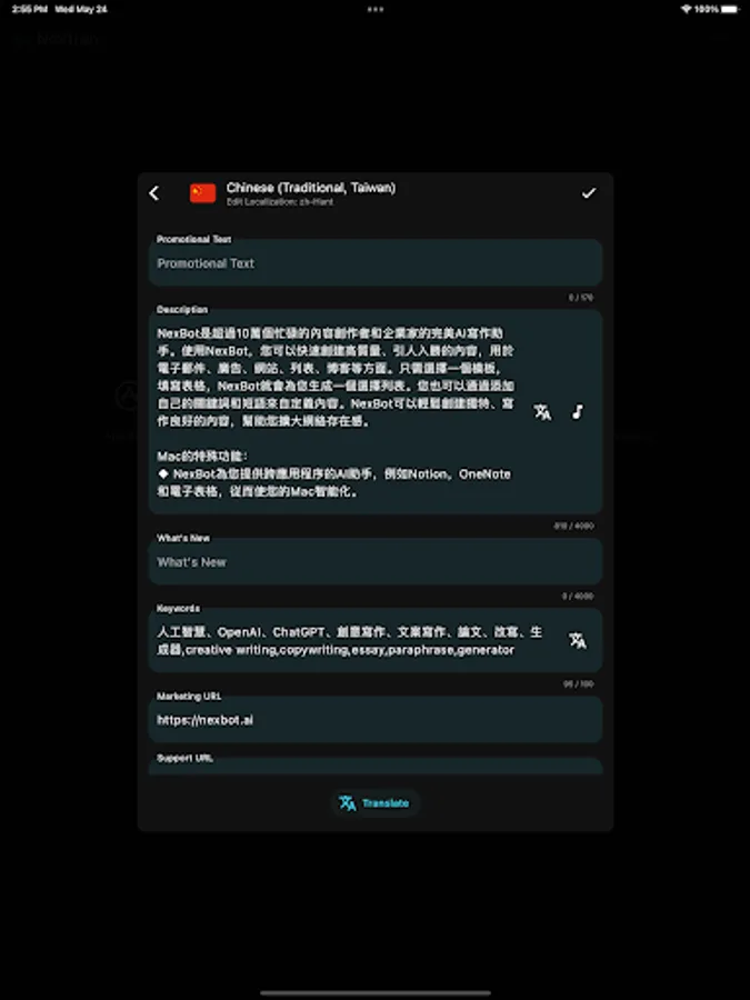 NexTran is a powerful tool that helps developers translate their App Store listings in seconds. With our AI-powered translation tool, you can easily translate your app's description, keywords, and other marketing materials into over 100 languages.