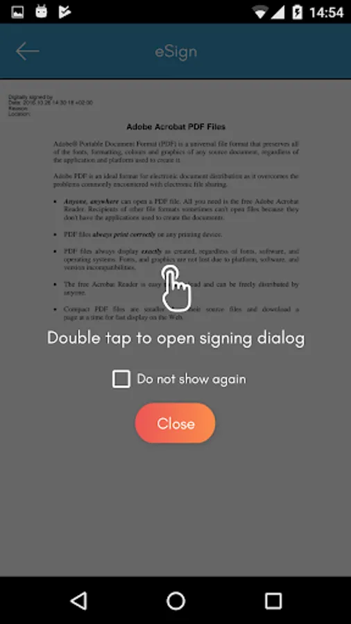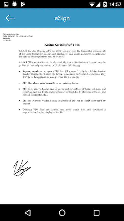 Nextsense eSign enables users to apply handwritten visual signature on PDF documents with attached ISO 19794-7 compliant XML signature format on documents submitted for signing by licensed 3rd party services. Allows user to preview a document submitted for signing and use the mobile handset as biometric document signing pad. The application captures unique, secure and verifiable signature timeseries data with additional signing metadata that results in protection against signature forgery.
