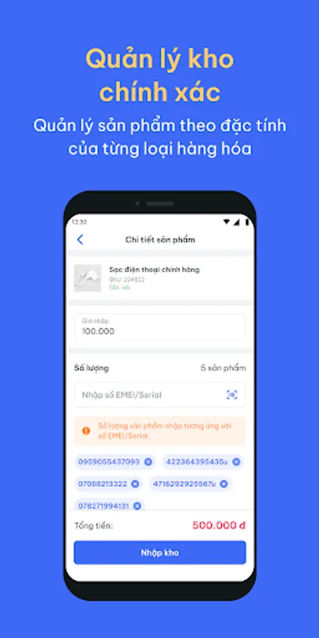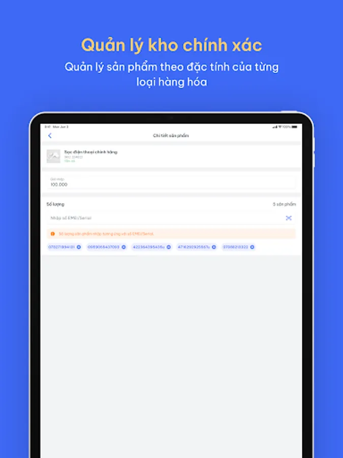 Manage products and goods in detail to each specific attribute such as: color, size, material, Serial number, IMEI... Update product information simply and quickly anytime, anywhere on any device . Smart product search and classification tools help you easily and quickly find the products you need.