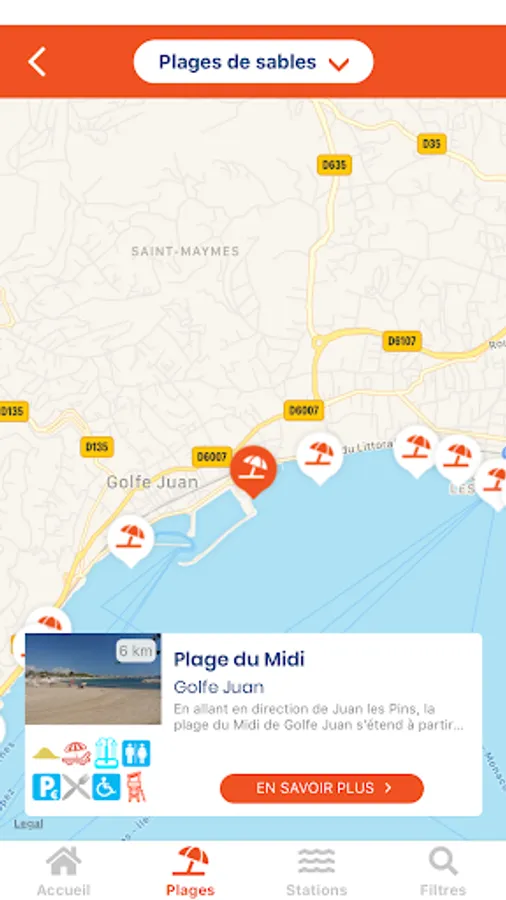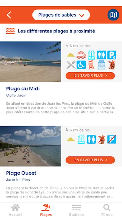 From your location or from a place of your choice, find your ideal beach in relation to many criteria (sand / pebbles, wild beaches, access, equipment, activities, dogs allowed, restaurants, free parking, ...).