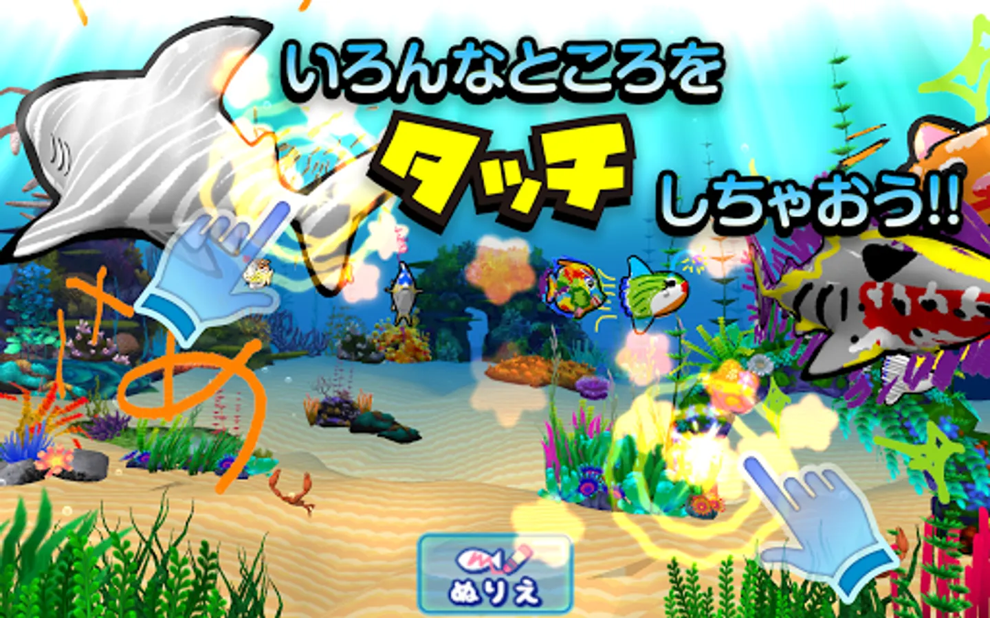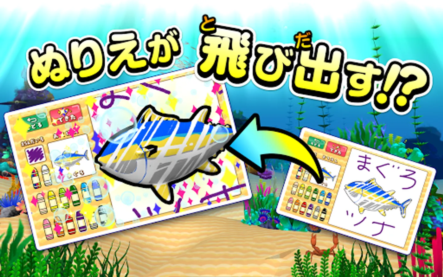 ぬりえをしたおさかなが、なんと3Dになってとびだし泳ぎだす、たのしいぬりえアプリです。