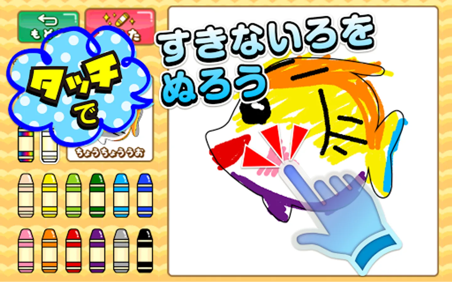 そんな大切な時期の知育教材として、”指をつかって色をぬり、楽しく動くお魚さんたちを鑑賞” ”おやこでいっしょにタッチして楽しむ"をキーワードに開発しました。