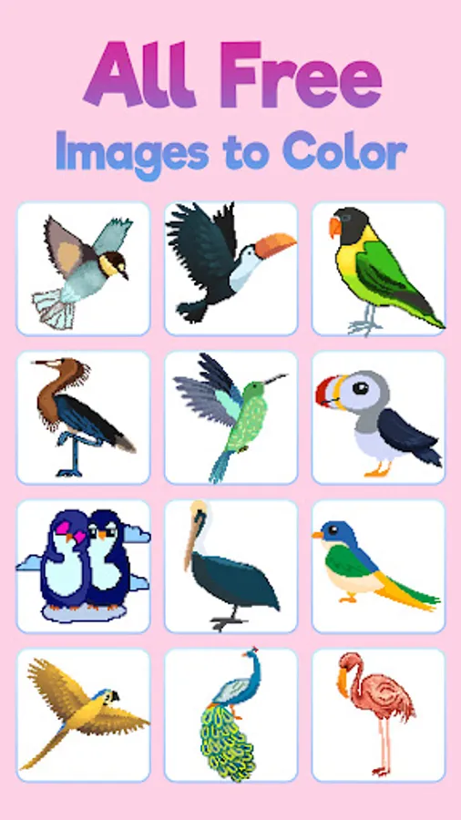 This pixel bird coloring book as a pixel art therapy helps you relieve stress and anxiety from reality. Whenever you want to meditate, relax and develop your concentration, just open the bird's color by number and start coloring.