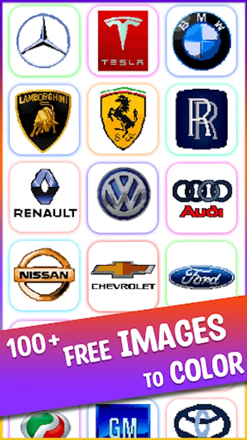 Cars Logo Coloring Book displays the different types of car logos with pixel coloring pages that can be colored according to the selected number colors. The game includes a lot of beautiful images of famous car brands, including BMW, Audi, Porsche, and Lamborghini. Enjoy some electronic music while you color your favorite logos and relieve stress.