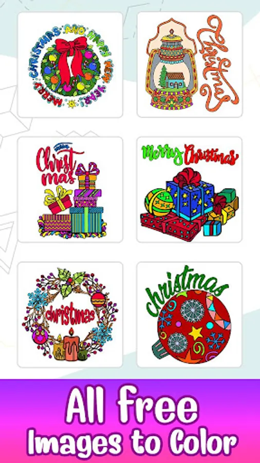 Enjoy the coloring cards with your creative ideas and feel like an artist with a complete variety of anti-stress pictures. Design your Christmas cards and spread good vibes with several free layouts. Choose from a library packed with awesome Santa Claus images, Christmas tree, snowman, or a Xmas gift. Fill your life with beautiful shades of colors and paint your imagination in the form of cards and release your stress and worries. Invigorate your artistic vision as you color a variety of calming and inspiring Christmas gifts.