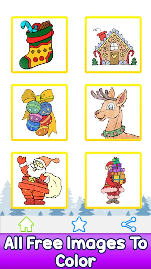 • Completed drawings can be saved in the gallery of Christmas Coloring Book and shared via email, Facebook or Twitter .