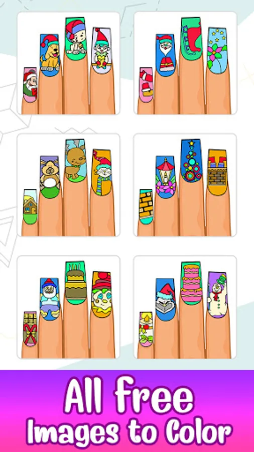 - Cheerful Santa elves are available to decorate on nails in this color therapy app.