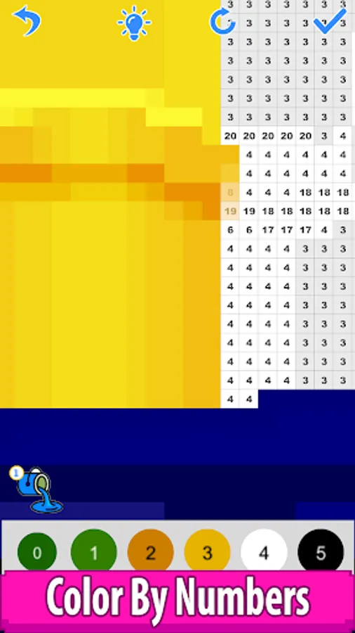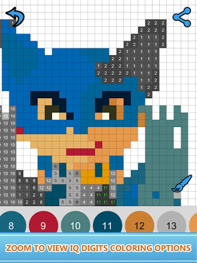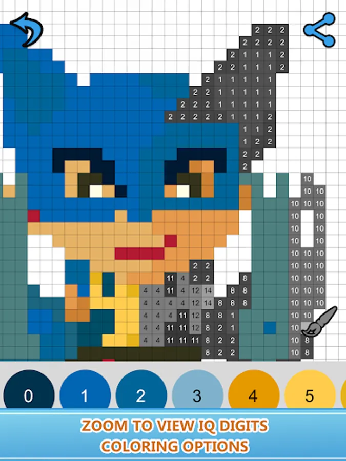 -When you zoom in,you will see that there are alot of small boxes with numbers inside which indicates that you will fill these numbers by the boxes given below with colors.Then choose colors according to numbers and paint boxes.