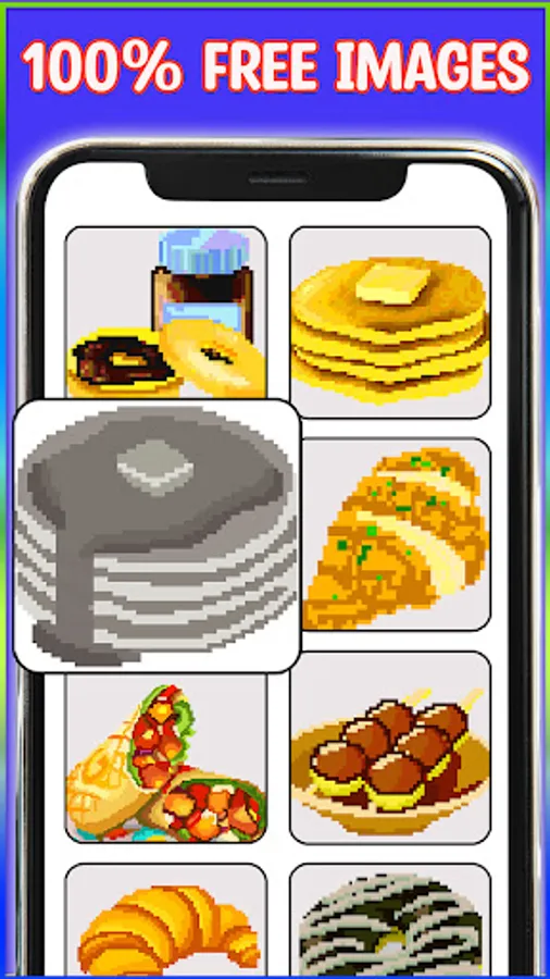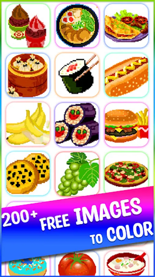 - Food pixel art coloring is also sandboxed color by number app in which most adorable foods turned into colorful pixel desserts.