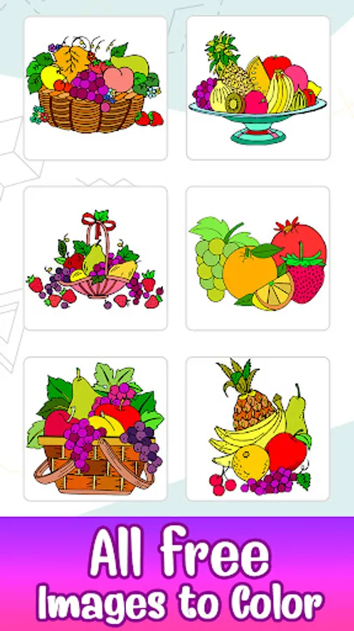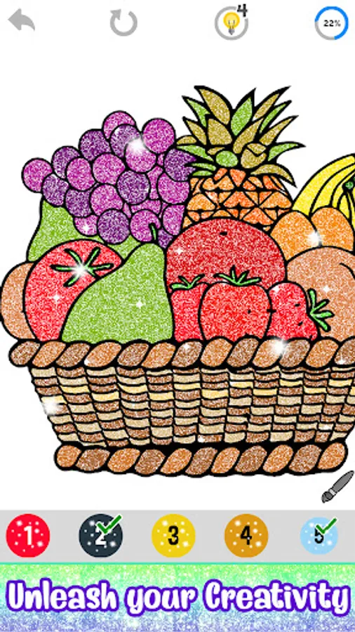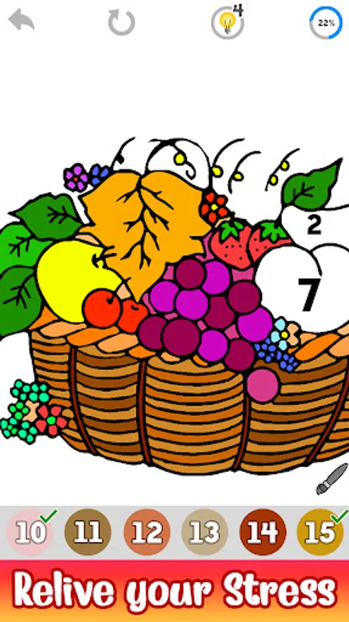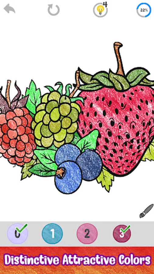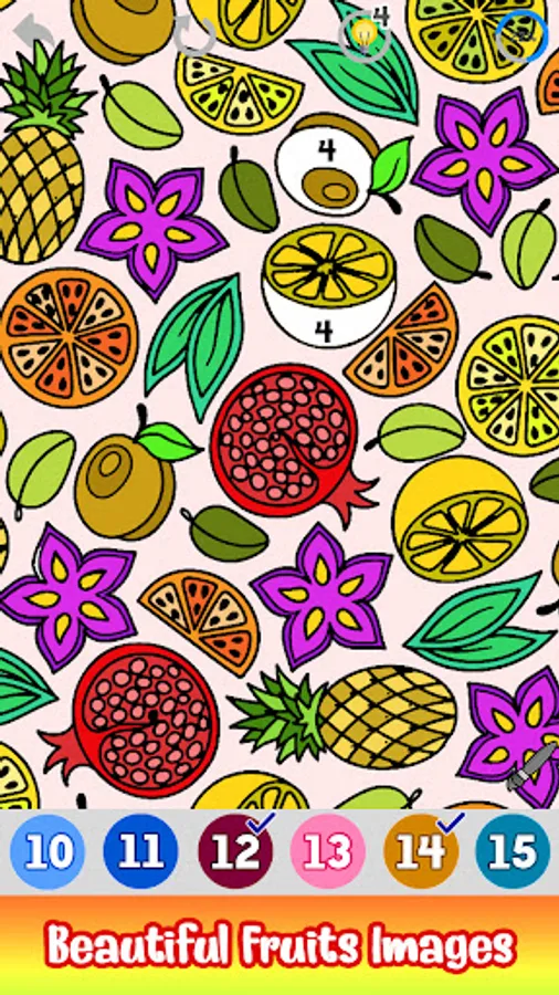 - Use hints to color the remaining part of the image and watch ads to unlock more fruits.