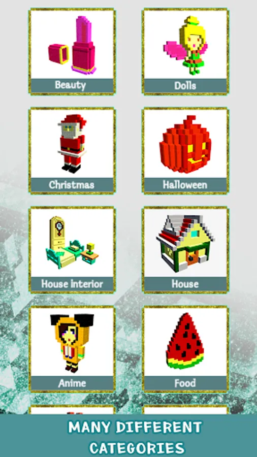 Voxel 3D Glitter Color by Number helps you to color pictures from all directions with the help of sparkly glitters. It's an excellent way to pass time with family for fun. Calm down and enjoy hours of peace and relaxation, develop your concentration and accuracy. Choose from a wide range of pictures and color by number the ones you like to create your artworks.