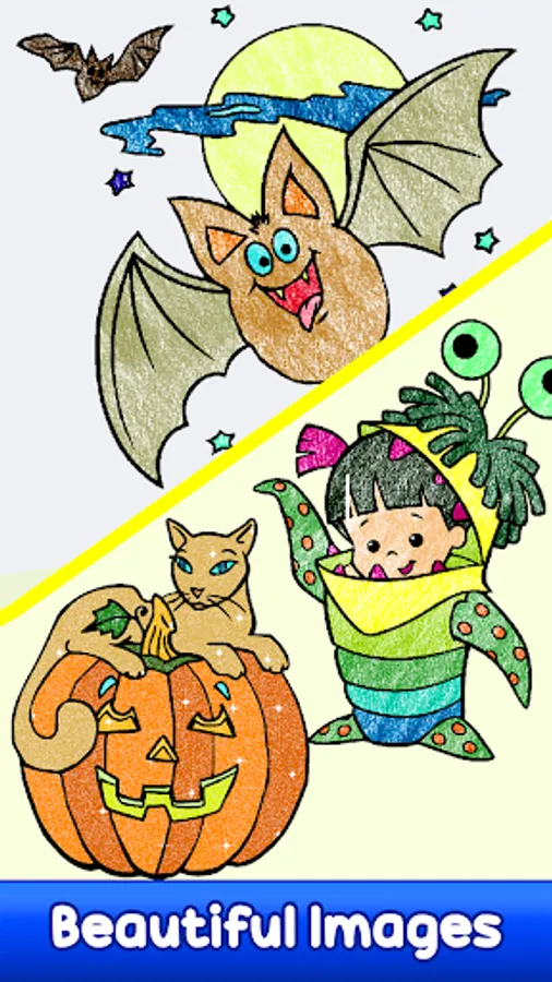 Paint and color the funniest Halloween drawings with a free coloring book for kids. Imagine yourself into the fantastic world of unpredictable creatures while filling glitters in the drawings. Make a unique artwork ever with different shinning shades of the glitter and fill the amazing pictures of Halloween Color By Number.