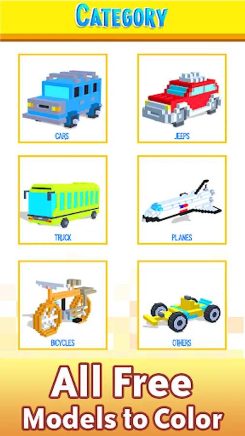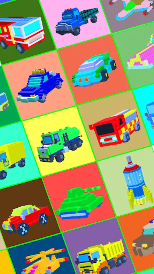 Vehicles Voxel Colouring Book is a fun and relaxing creative coloring book created especially for all ages, and makes the perfect gift for all people in your life. Emit emotional expressions through color streaks on different racing cars. You will see the various variety of vehicles like sports & racing cars, modern, vintage classic retro cars, heavy trucks and builder's technics, car parts, cool offroad monster trucks, and others. This color therapy game trains the mind to concentrate better, relax, and reset.