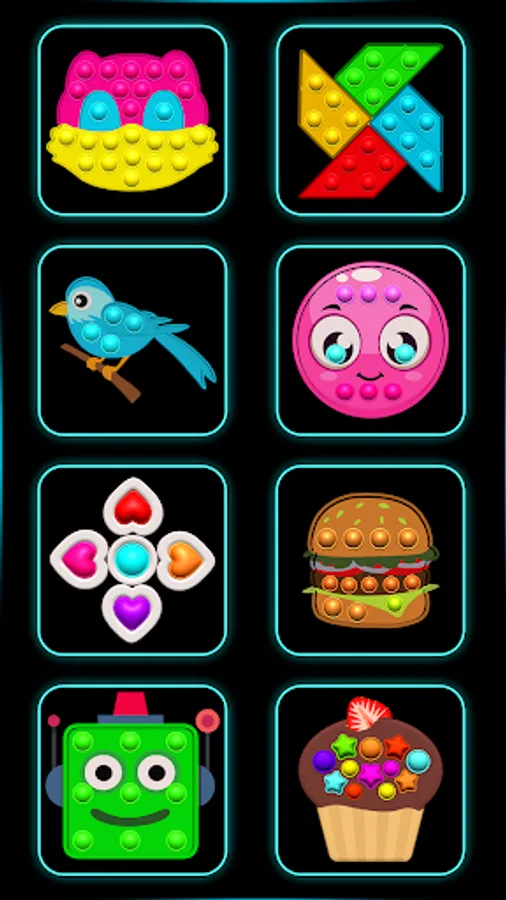 Fantastic shapes and glow designs like rainbow heart,connect alphabet Lore,simple dimple pop and unicorn pops.