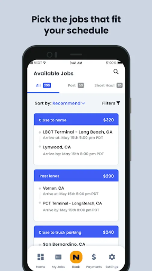 ● Shape your work schedule with the Available Jobs experience - the redesigned marketplace makes it easy to view loads by load type, such as roundtrip, drop-and-hook and more