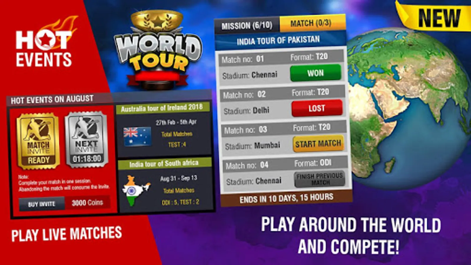 · 18 different international teams, 10 domestic teams, 42 different stadiums. TEST Cricket, Hot Events and more than 11 tournaments including World Cup, World T20 Cup, Blitz Tournament and ODI Series.