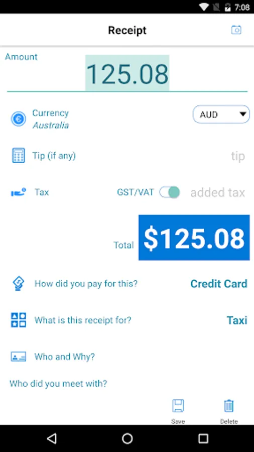 Get started by simply taking a picture! You get instant organization. Capture receipts into Date folders or add them to a specific Trip folder you name. Keeps clients and trips organized! Simple menus edit, add, delete, send, export and sync records.