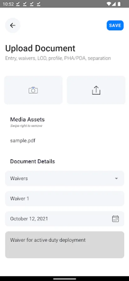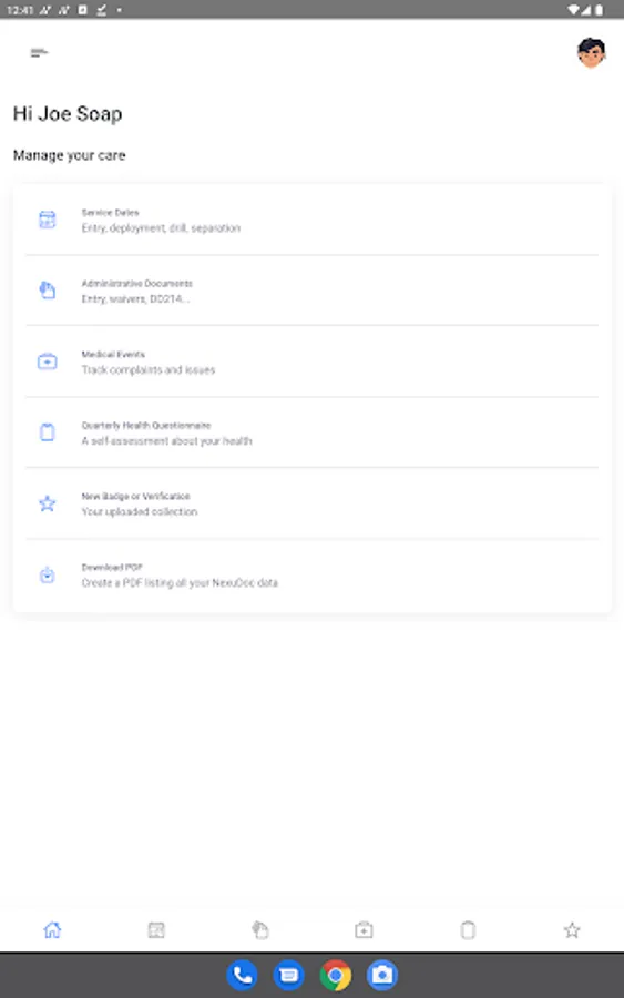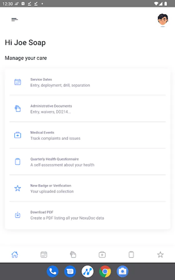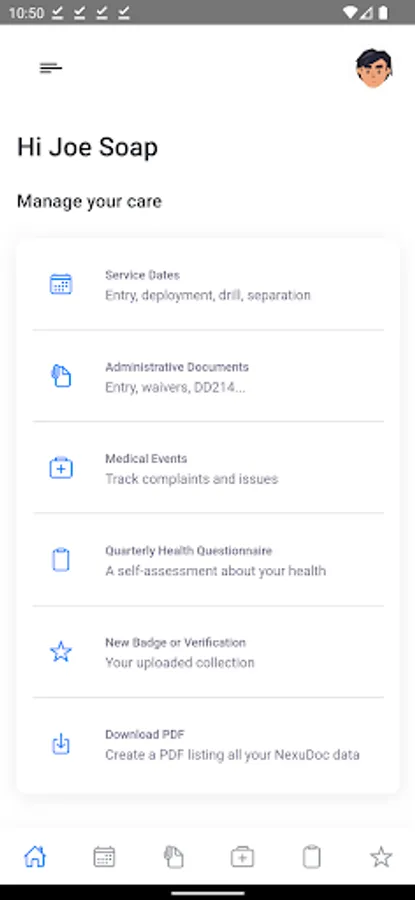 NexuDoc is a mobile application that places service members in charge of their own military medical records. This allows for immediate documentation of injury and self-monitoring of health every 3 months. Each user will have the ability to export military medical records focal to compensation and pension directly to 3rd parties of Veteran’s choice. Veterans’ records are private and under their control until they are ready to share them. This helps set up for successful compensation and pension claim to get the benefits and compensation you deserve for an injury, illness or exposure caused by service.