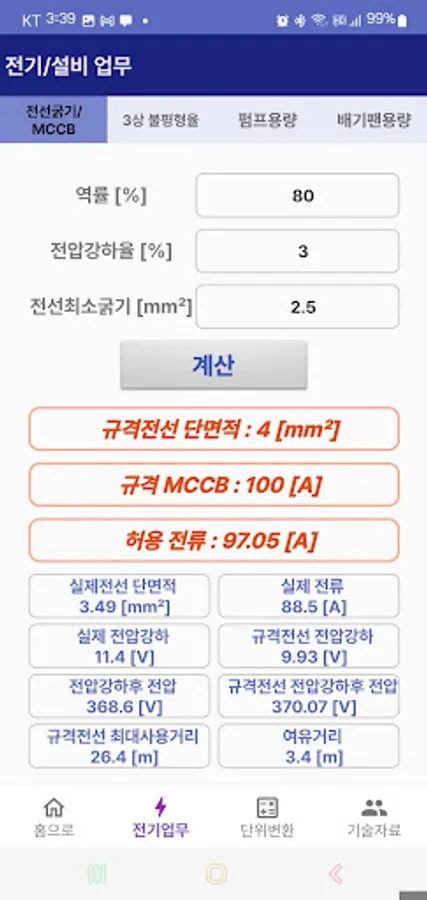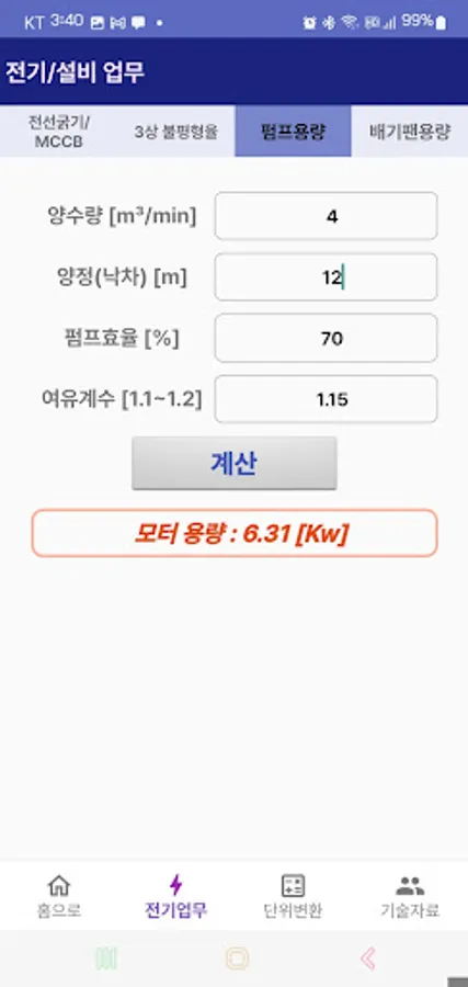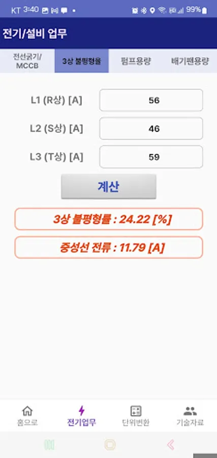 1. Electricity-related tasks such as calculating the cross-sectional area of electric wires required by electrical engineers, selecting MCCBs, 3-phase unbalance ratios, and selecting motors for pumps and exhaust fans.
